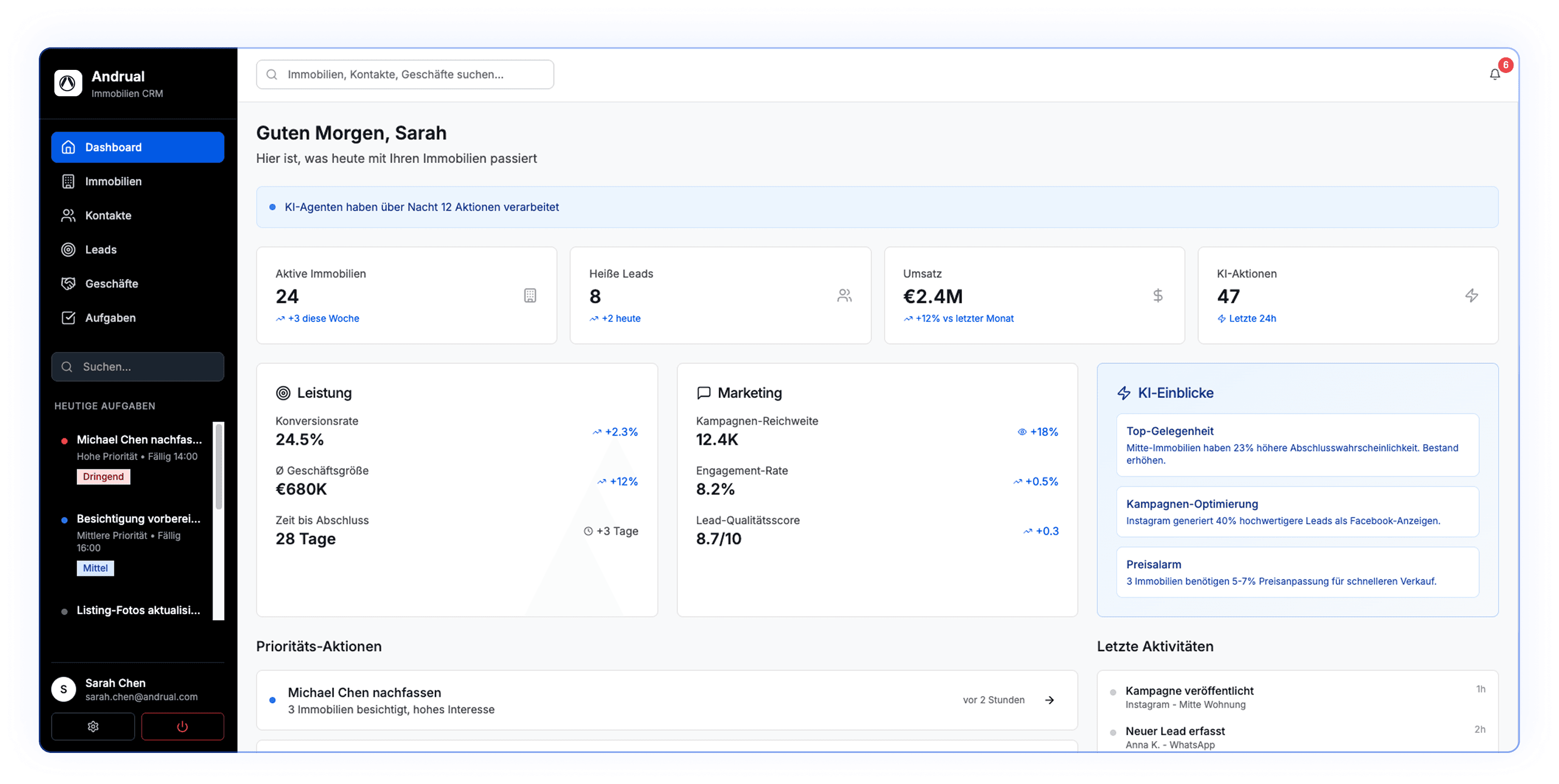 Dein Dashboard denkt mit: Andrual AI aktualisiert automatisch alle Kennzahlen in Echtzeit – von Leads über Umsätze bis zu Marketing-Performance. Wichtige Kontakte werden hervorgehoben, Chancen klar markiert, und du siehst auf einen Blick, wie dein Geschäft wächst. So weißt du jederzeit, worauf du dich konzentrieren solltest.